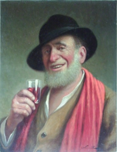 465 | Freundlich lächelnder älterer Herr mit grauen Haaren, schwarzem Hut und rotem Schal genießt ein Glas Weißwein. (Öl/Holz) Anmerkung: rechts unten signiert Ähnliche Motive: trinkende Männer | -/- (hoch) | Wurde im August 2021 bei www.ebay.de angeboten (eBay-Artikelnummer: 255074280826). |