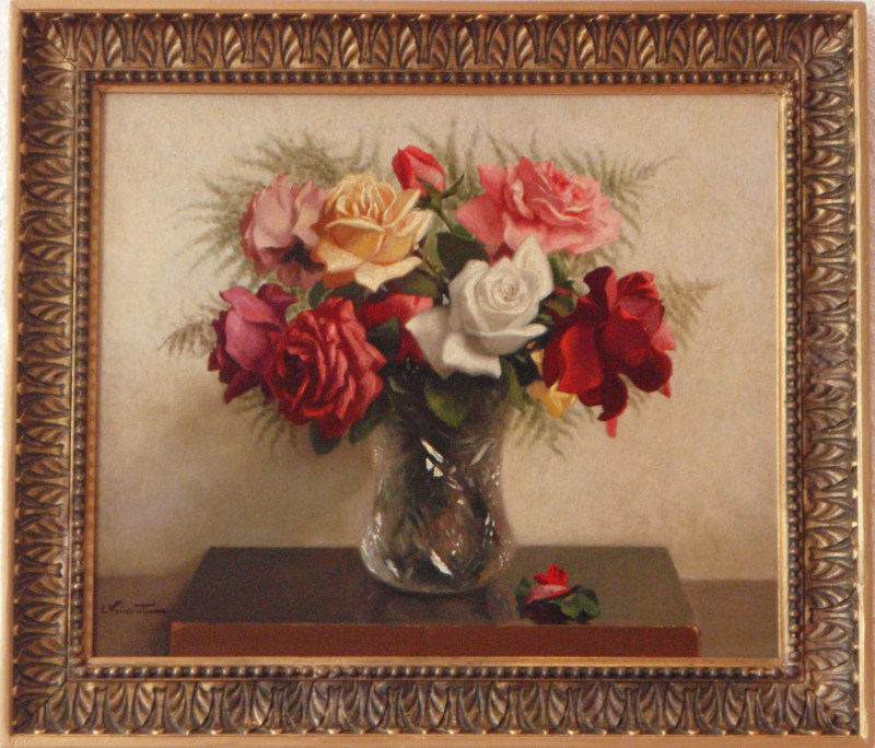 478 | Rosenstrauß in schwarzer Kugelvase - Blumenstillleben mit ca. 14 farblich gemischten Rosen in einer schwarzen Kugelvase auf einem Holzpodest. (Öl/Leinwand) Anmerkung: rechts unten signiert Ähnliche Motive: Blumen | 70/60 (quer) | Privatbesitz |