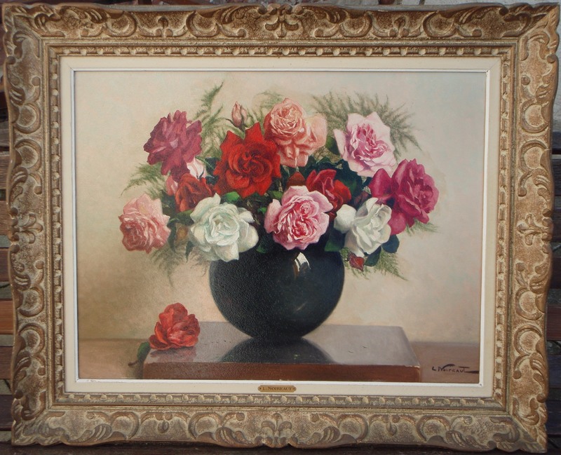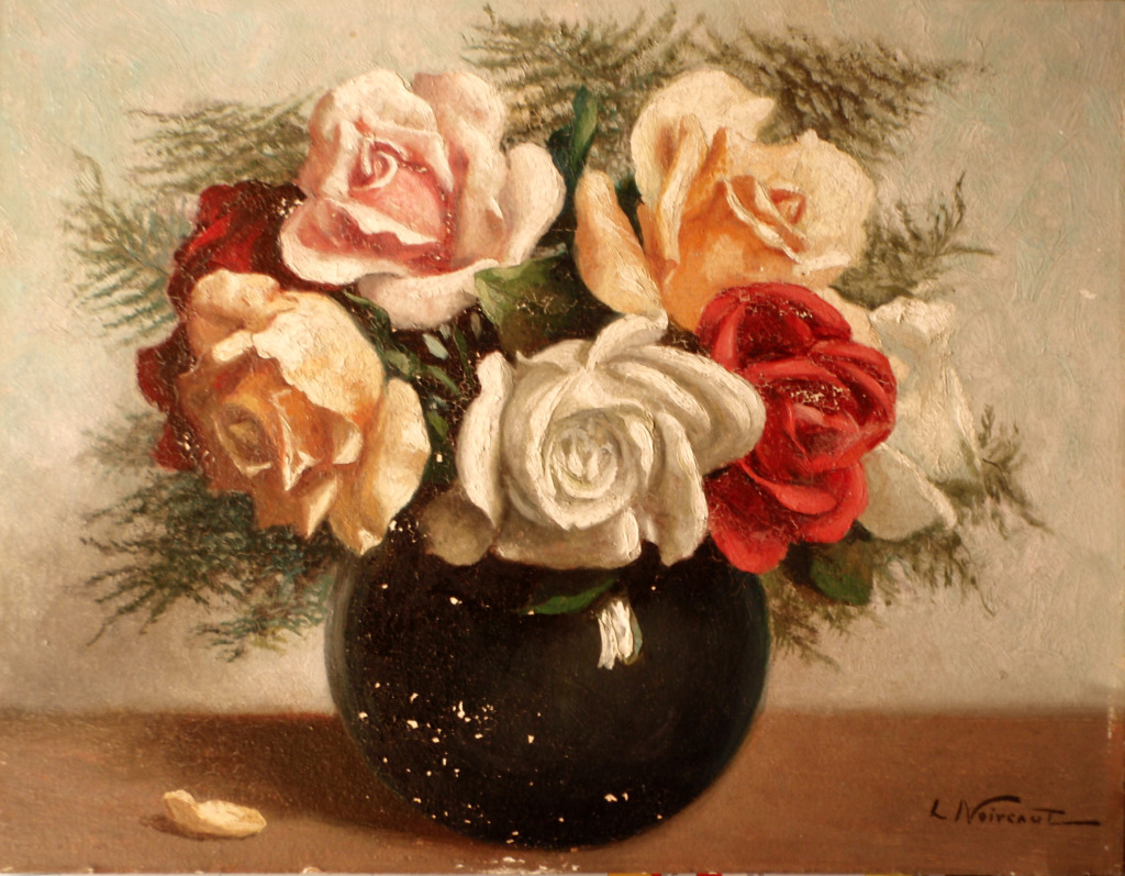 530 | Bouquet de rose - Ein Strauß mit Rosen in verschiedenen Farben in einer messingfarbenen Vase (Öl/Holz) Anmerkung: links unten signiert Ähnliche Motive: Blumen | -/- (quer) | Wurde im November 2024 bei www.leboncoin.fr entdeckt. |