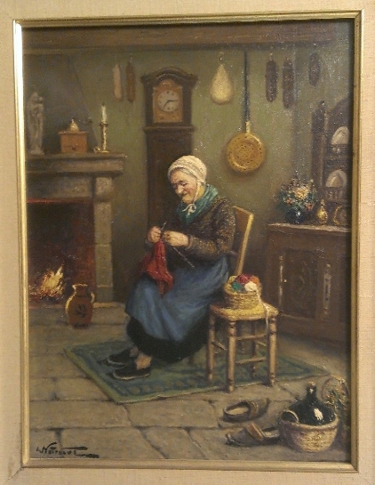 Pescador - Graubärtiger Pfeife rauchender Fischer mit rotem Schal und schwarzer Mütze sitzt in der Stube auf der Bank am brennenden Kaminfeuer und flickt ein Fischernetz. (Öl/Hartfaserplatte) Ähnliche Motive: 335, 303, 340 Signatur: rechts unten | 25,5/34 - 39/47 (hoch) | Wurde im Mai 2023 bei www.custojusto.pt zum Kauf angeboten: N 22324 |