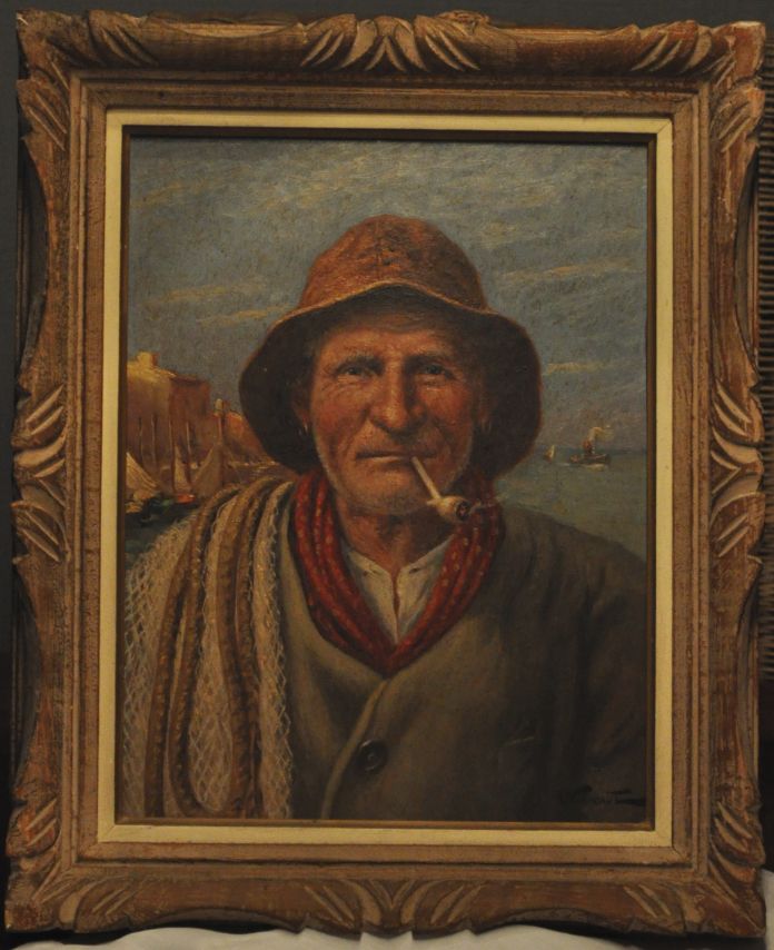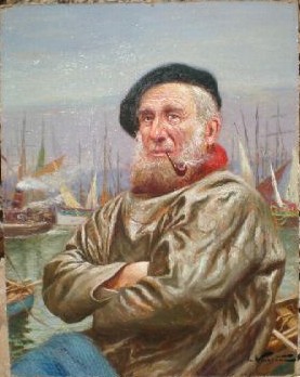 512 | Old Man - graubärtiger Seemann mit Südwester und Fischernetz über der linken Schulter genießt eine Tabakspfeife. Im Hintergrund fliegen Möven über dem Hafen von Martiques. (Öl/Leinwand) Anmerkung: rechts unten signiert Ähnliche Motive: rauchende Männer | 33/25 (hoch) | Wurde im August 2023 bei www.lot-art.com (Lot 0030) erwähnt. |