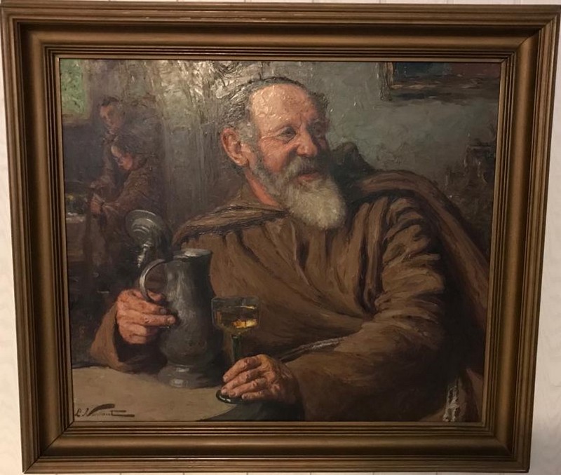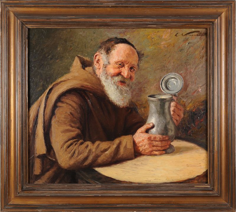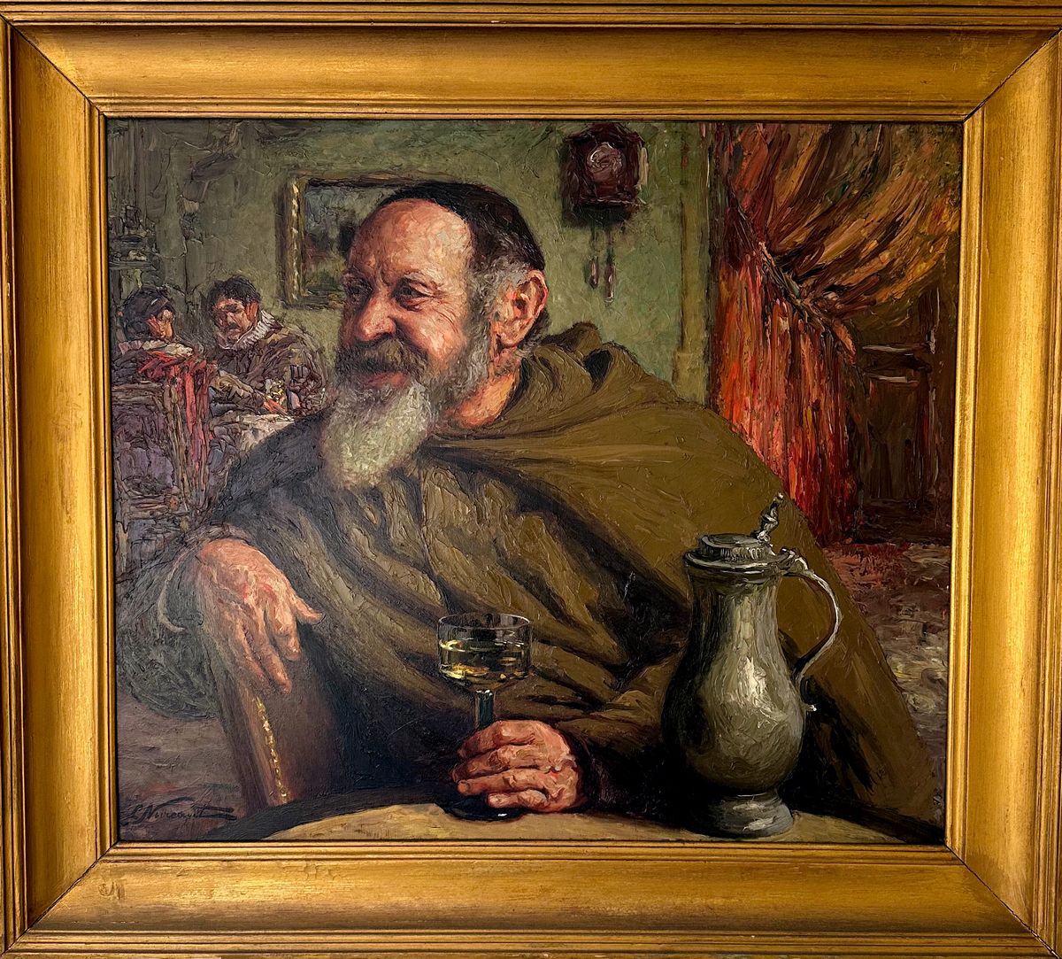 Weintrinkender bärtiger Mönch mit Zinnkrug und Römerglas (Öl/Holz) Anmerkung: links unten signiert Ähnliche Motive: Mönche | 85/75 - 100/90 (quer) | Privatbesitz: Familie Schneider |