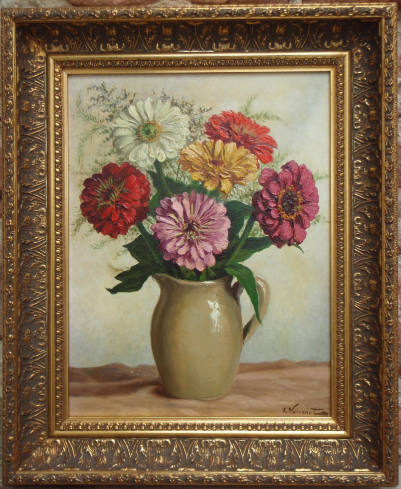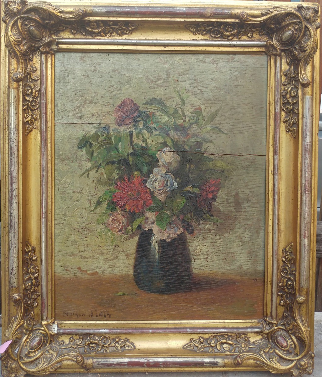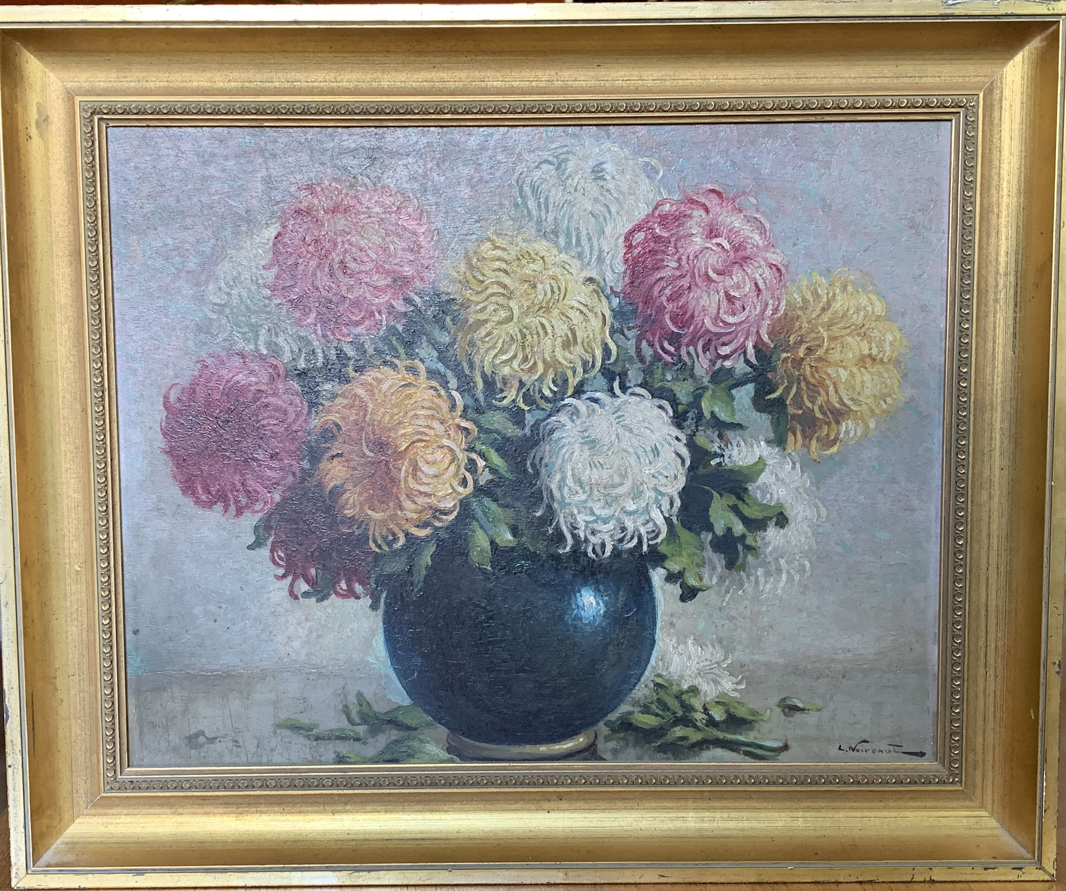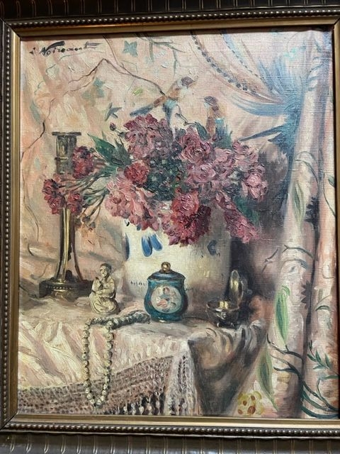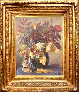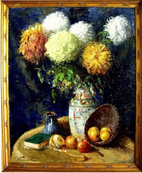 528 | Ein schöner Strauß mit orange-gelben Chrysanthemen in einem Steinzeug-Krug mit Henkel (Öl/Holz) Anmerkung: rechts unten signiert Ähnliche Motive: Blumen | -/- (hoch) | Wurde im November 2024 bei www.leboncoin.fr entdeckt. |
