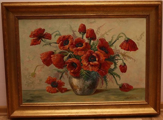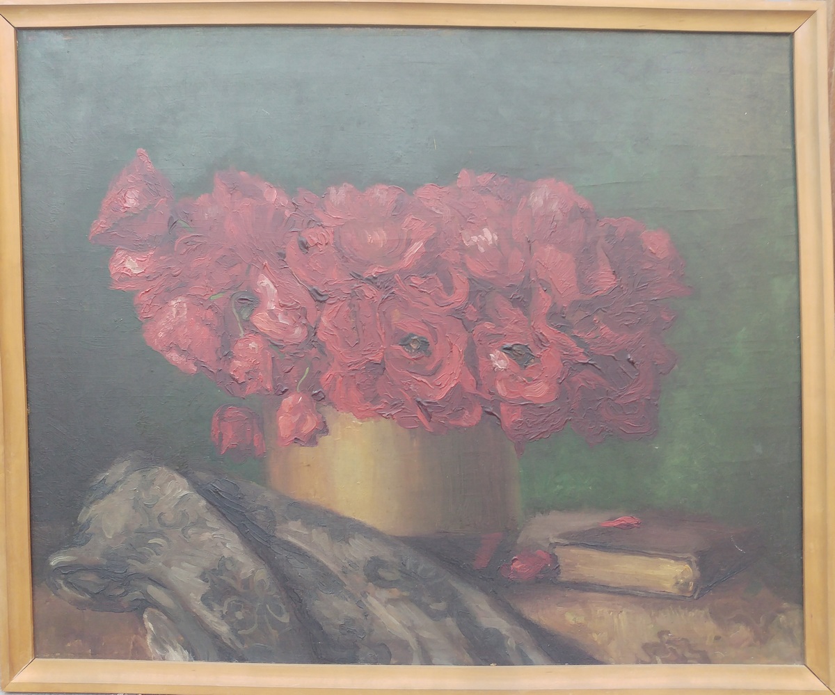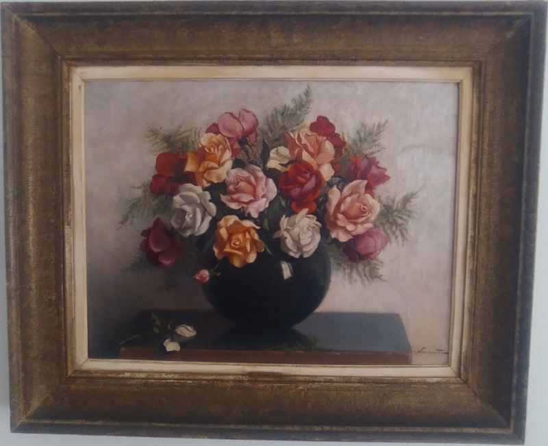 474 | Bouquet of roses - Ein Strauß bunter Rosen in einer blauen Kugelvase auf einem rotbraunen Tischtuch. (Öl/Leinwand) Anmerkung: rechts unten signiert Ähnliche Motive: Blumen | 54/72,5 - 70/88 (quer) | Wurde im Januar 2022 auf der Seite www.selency.nl entdeckt. |