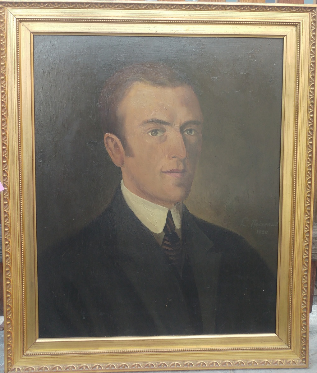 547 | Portrait of man maybe traveler - Halbprofilansicht eines schwarz-grauhaarigen Mannes mit schwarzem Hut, rotem Halstuch, weißem Hemd und blau-brauner Weste mit weißen Knöpfen der den Daumen seiner rechten Hand lässig in die Ärmelöffnung eingehakt hält. (Öl/Leinwand) Anmerkung: Signatur "Noireaut" rechts oben