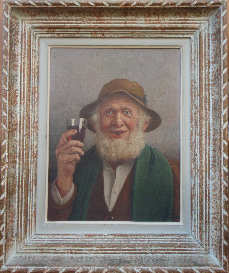 502 | A Glass of Red! - grauhaariger Mann mit Vollbart und rotem Schal hält ein Glas Rotwein mit einem prüfenden Blick freundlich lächelnd in die Höhe. (Öl/-) Anmerkung: rechts unten signiert / auf der Rückseite wurde die Jahreszahl 1935 notiert. Ähnliche Motive: trinkende Männer | 46/38 - 58/51 (hoch) | Wurde im Mai 2023 bei www.ebay.co.uk (eBay item number: 354772556894) angeboten. |