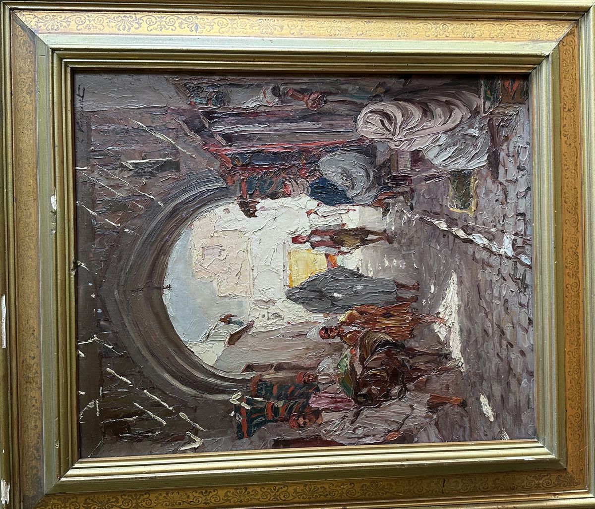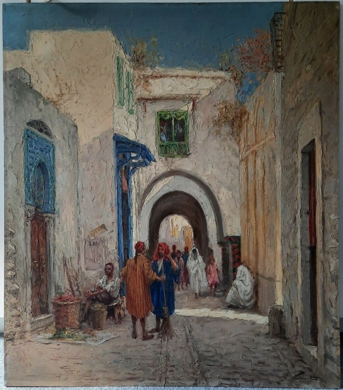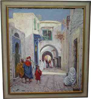 Peinture Orientaliste - Menschen in der historischen Altstadt von Tunis (Öl/Holz) Anmerkung: links unten signiert Ähnliche Motive: Nr. 051, 055, 080, 081, 318, 440 und 463. | 41,5/33 - 53/44,5 (quer) | Wurde im September 2022 bei www.proantic.com erwähnt. |