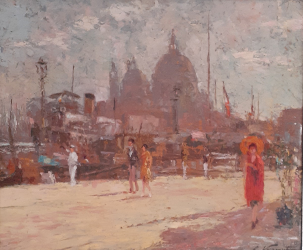 488 | Venedig mit Santa Maria della Salute im Hintergrund - Passanten auf der sonnenbeschienenen Promenade (Öl/Holzfaserplatte) Anmerkung: rechts unten signiert | 82×71 (quer) | Privatsammlung B. K. |