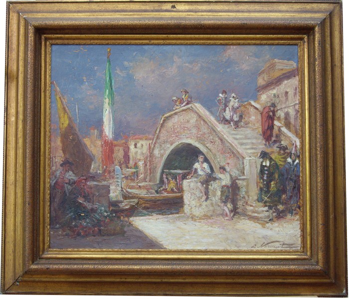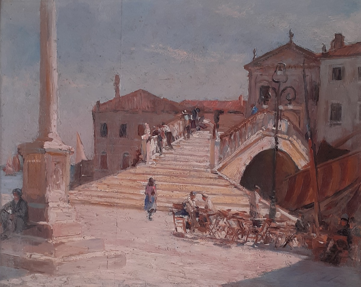490 | Brücke in Venedig - Eine Straßenszene in Venedig mit Brücke und Straßencafé im Vordergrund (Öl/Holzfaserplatte) Anmerkung: rechts unten signiert Ähnliche Motive: Nr. 0056, 0064 und 0409 | 81×70 (quer) | Privatsammlung B. K. |