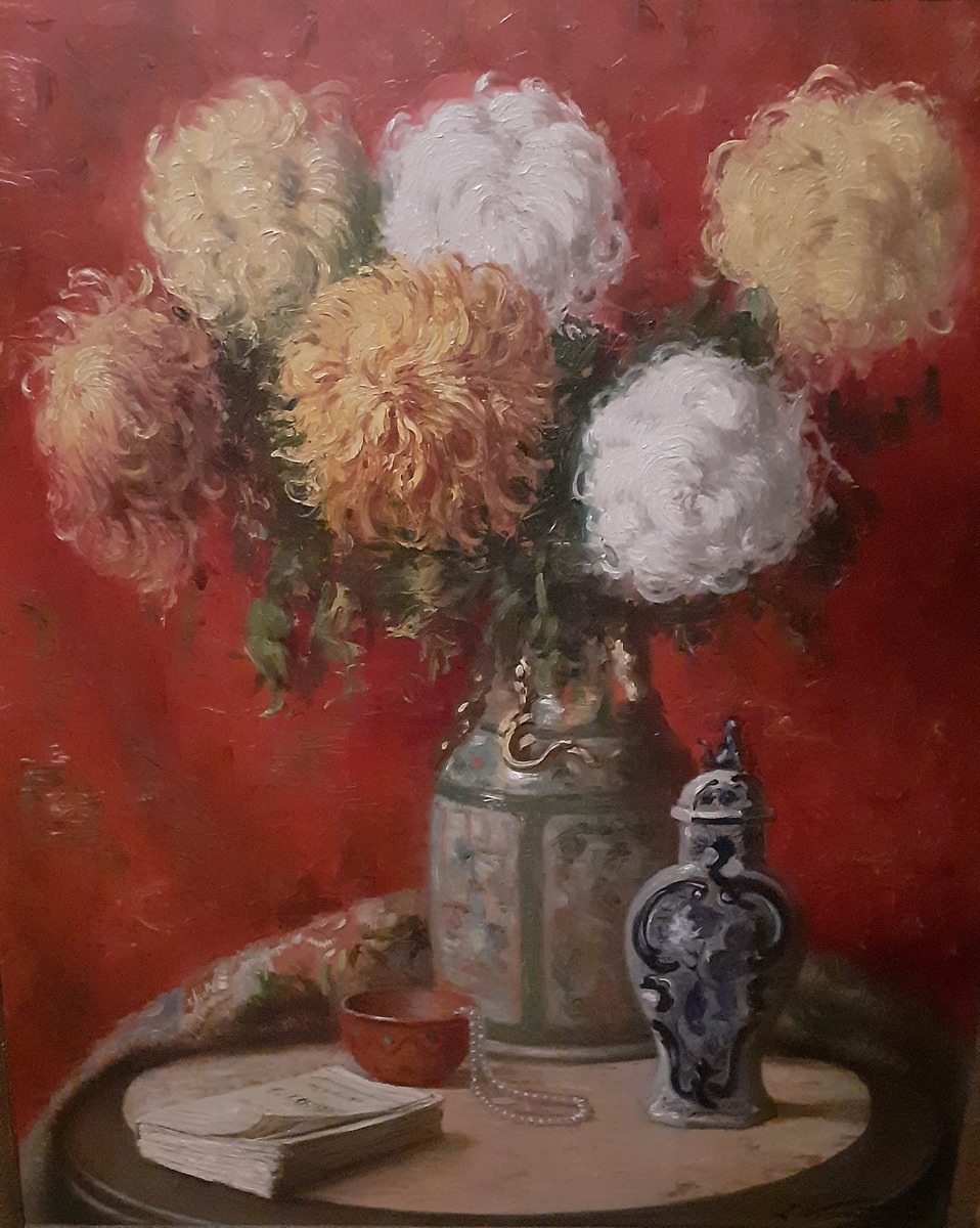 491 | Blumenstillleben - eine verzierte grüne Porzellanvase mit sechs großen Chrysanthemen auf einem runden Tisch, davor befinden sich ein Buch, eine Schale mit Perlenkette und ein blau-graues Gefäß mit Deckel (Öl/Holzfaserplatte) Ähnliches Gemälde: Nr. 0100 | 98×114 (hoch) | Privatsammlung B. K. (Das Gemälde wird zum Kauf angeboten). |