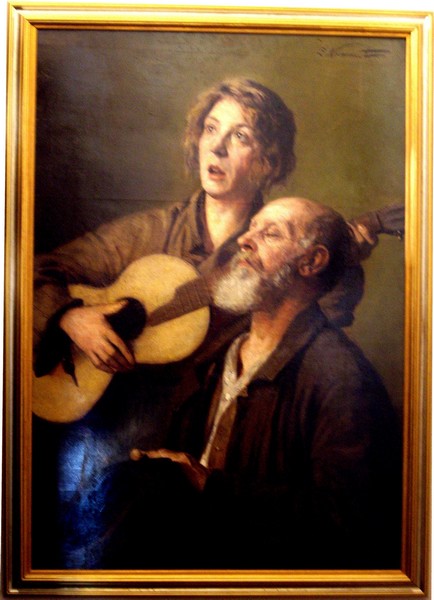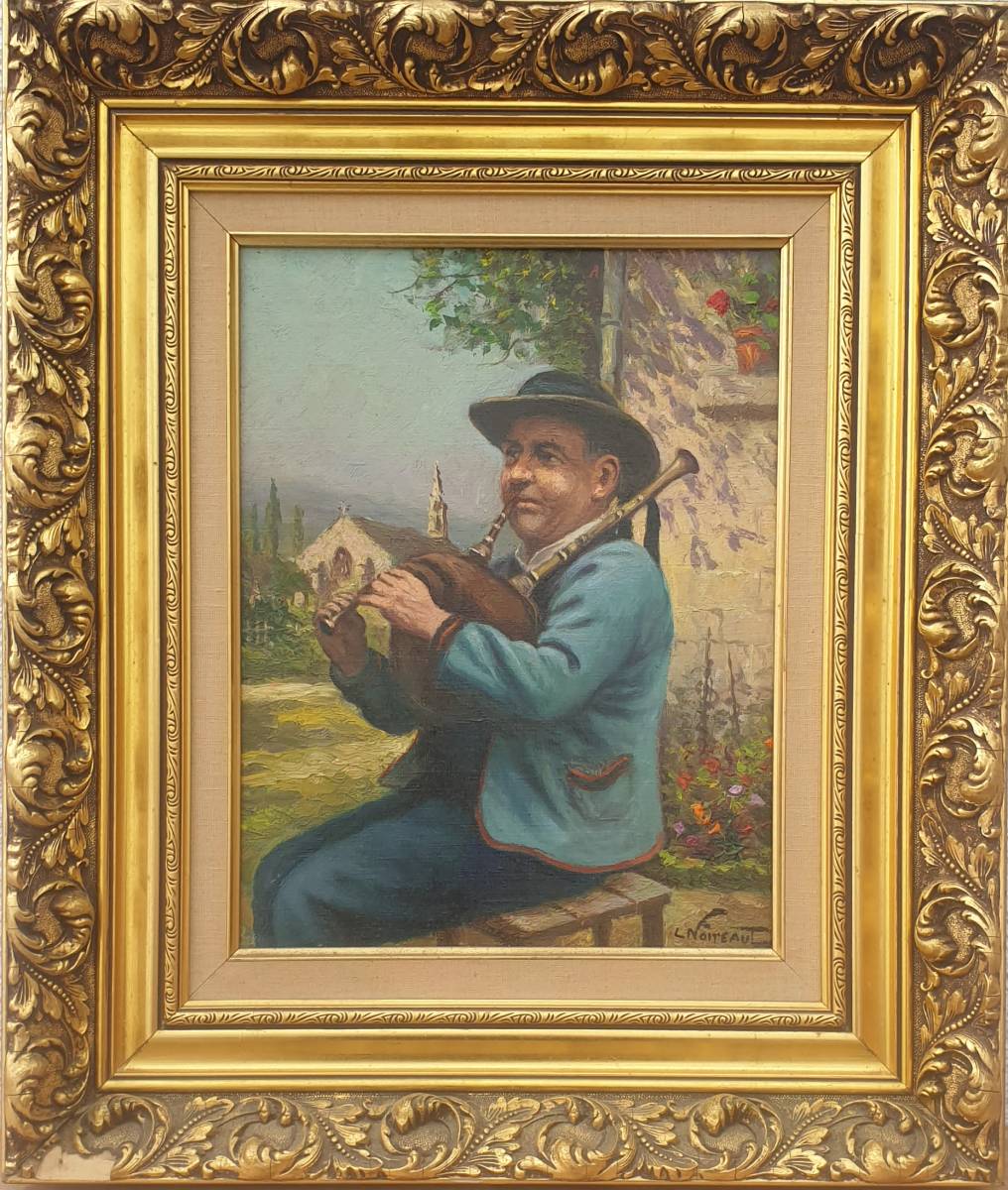 520 | Bagpipe - Musiker mit schwarzem Hut und blauem Anzug sitzt Dudelsack spielend im Schatten vor einem Haus mit einer kleinen Kirche im Hintergrund (Öl/Leinwand) Signatur: rechts unten Ähnliche Motive: 0341 | 27/35 (hoch) | Sammlung S. B. (Deutschland) |