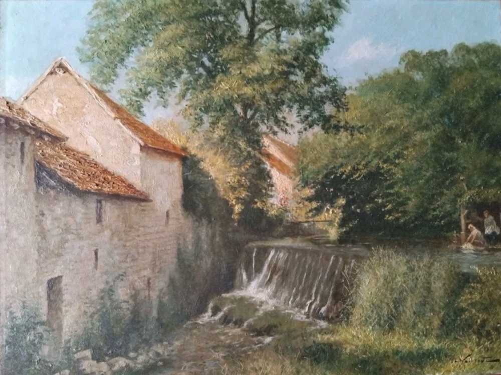 532 | Zwei Frauen waschen Wäsche am Bach oberhalb des kleinen Wasserfalls - Der Bach fließt an der Rückseite der Dorfhäuser entlang. Im Hintergrund führt ein kleiner Steg aus dem Dorf über den Bach. (Öl/Holzfaserplatte) Anmerkung: rechts unten signiert Ähnliche Motive: Nr. 0170, 0357, 0362, 0406 und 0407 | 33×27 (quer) | Sammlung S. B. (Deutschland) |