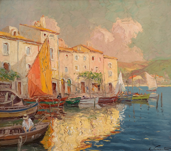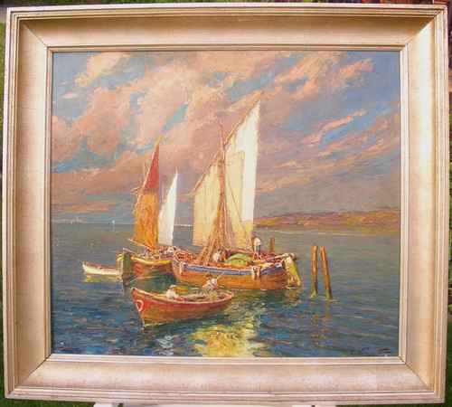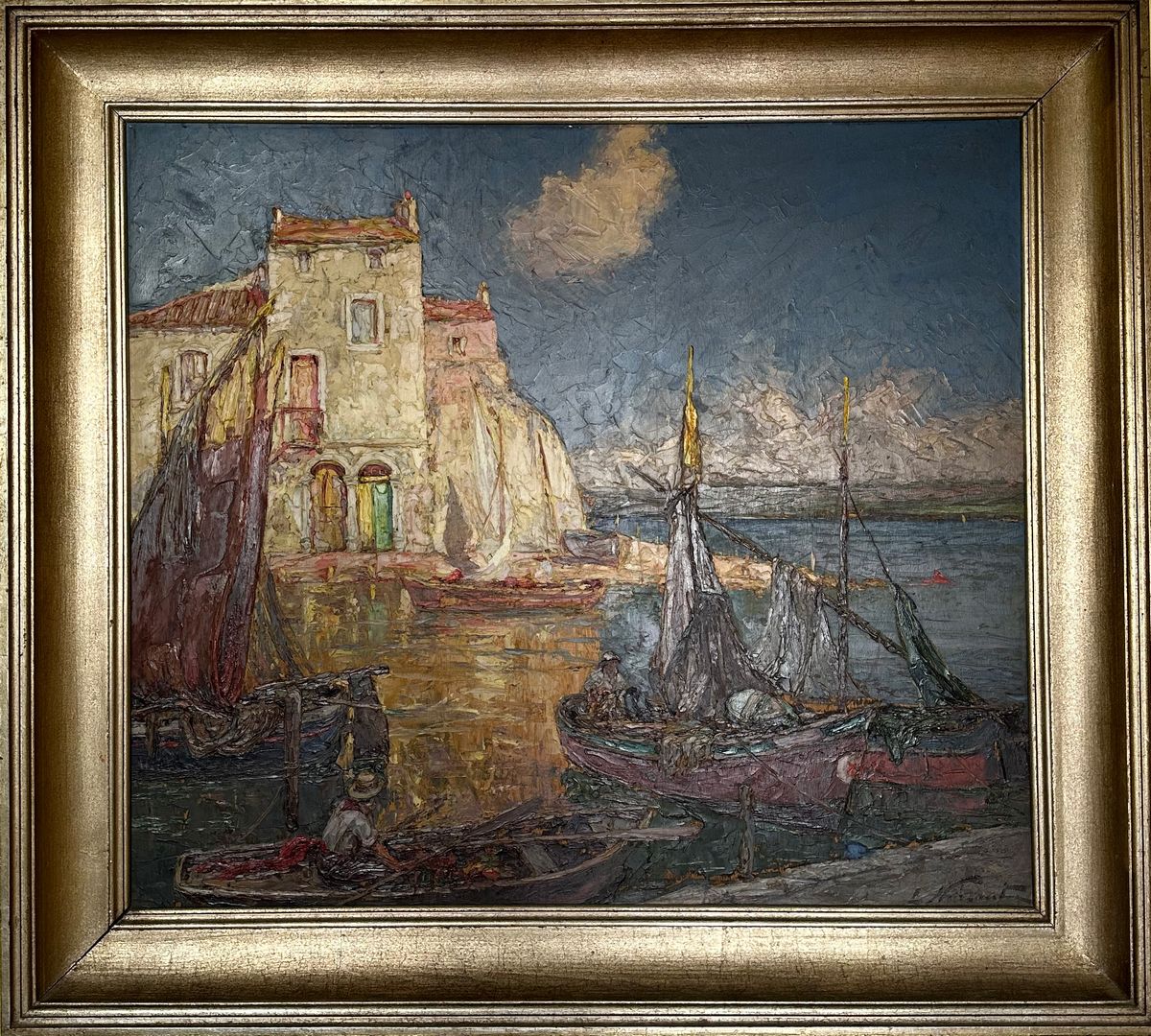 507 | Le départ de pêche près des Martigues - Fischer mit ihren Booten im idyllischen Hafen von Martigues. (Öl/Hartfaserplatte) Anmerkung: rechts unten signiert Ähnliche Motive: Fischerboote | 44/35 (quer) | Wurde im Juni 2023 bei www.mutualart.com zur Versteigerung angeboten. |