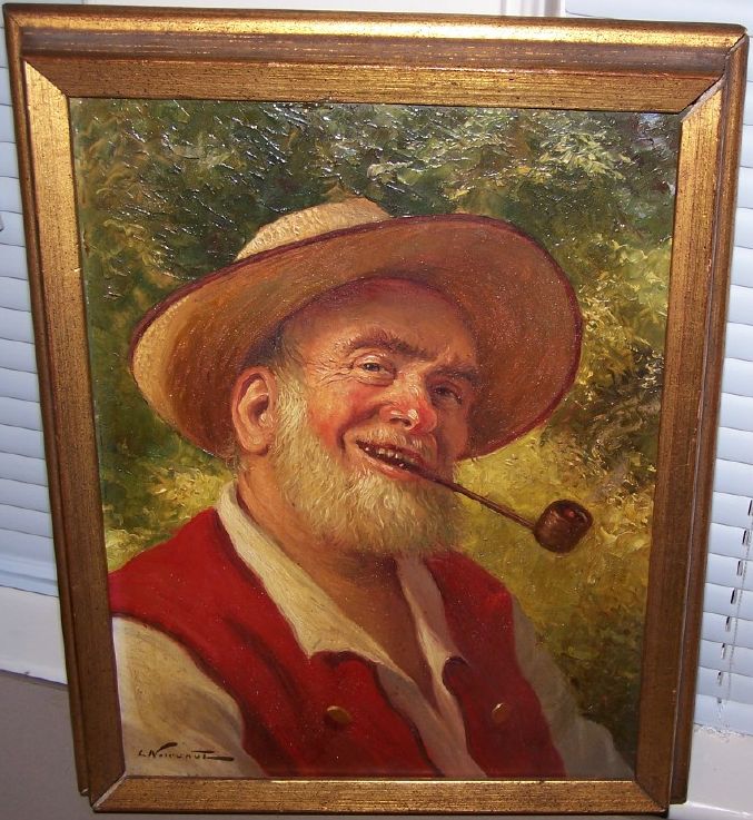 480 | L'homme à la pipe - freundlich lächelnder Herr mit Dreitagebart und Strohhut genießt eine Tabakspfeife. (Öl/Hartfaserplatte) Anmerkung: rechts unten mit "E. BARO" signiert Ähnliche Motive: rauchende Männer | 35/27 - 44/36 (hoch) | Wurde im Juli 2022 bei www.ebay.fr (eBay-Artikelnummer: 275379376172) angeboten. |