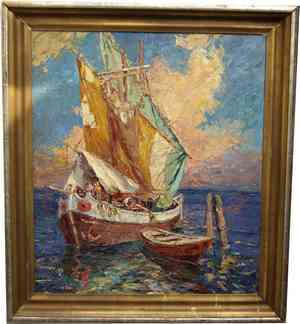 462 | Italienische Hafenszene - mehrere kleine Fischerboote liegen ruhig in der idyllischen Hafenbucht von Martigues, im Hintergrund der Kirchturm von Sainte Marie-Madelaine. (Öl/Holz) Anmerkung: links unten signiert Ähnliche Motive: Fischerboote | 94/118 (quer) | Wurde im Mai 2021 bei www.auctions-fischer.de angeboten (Katalog: 286-II / Lot. 1516). |