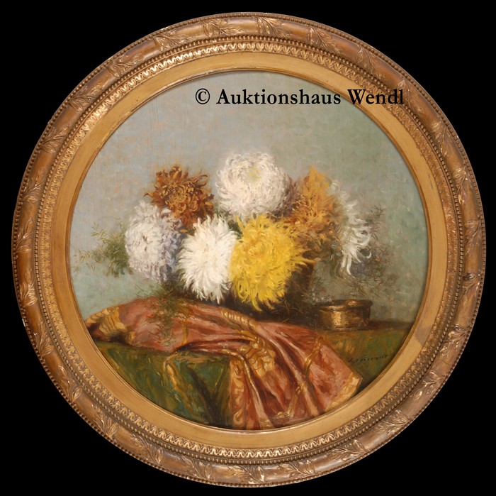 497 | Stillleben mit Blumen - Chrysanthemenstrauß mit neun Blüten (4 x gelb, 5 x weiß) in ovaler Vase auf einem mit Tüchern abgedeckten Tisch mit Messing-Schale und blau-grauem Gefäß mit Deckel (Öl/Holz) Anmerkung: links unten signiert Ähnliche Motive: Blumen | 97/74 - 114/91 (oval) | Wurde am 29.10.2022 bei www.auktionshaus-wendl.de zur Versteigerung angeboten (Lot: 3570). |