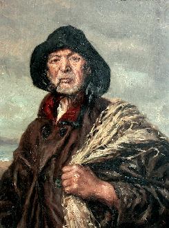 482 | Seemann mit Tabakspfeife - freundlicher Fischer mit Dreitagebart und Südwester trägt ein aufgerolltes Seil über der rechten Schulter und genießt eine Tabakspfeife. (Öl/Hartfaserplatte) Anmerkung: links unten mit "E. BARO" signiert Ähnliche Motive: rauchende Männer | 35/27 - 44/36 (hoch) | Wurde im September 2022 bei Instagram erwähnt. |