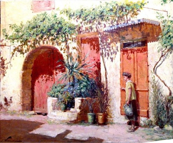 515 | La treille - romantischer Hintereingang im Sommer mit Topfpflanzen und am Haus emporwachsenden Kletterpflanzen (Öl/Leinwand) Ähnliche Motive: 0091, 0131, 0157 und 0175 | 54/45 - 63,2/54,3 (quer) | Wurde im Oktober 2023 bei ebay.fr angeboten. Artikelnummer: 305122823434. |
