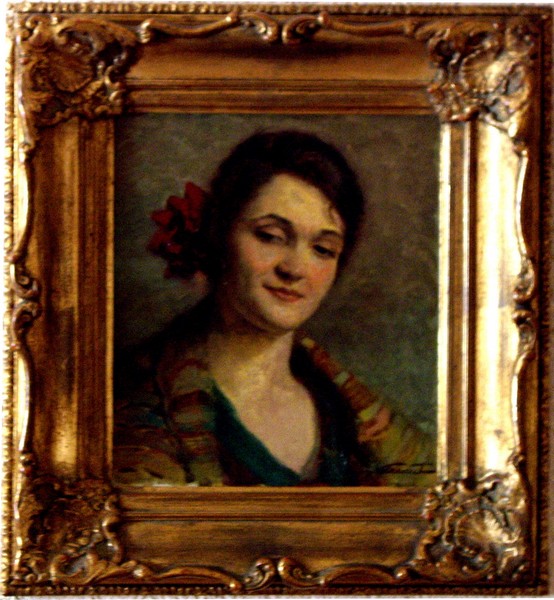 517 | Blumenverkäuferin mit Schal hält einen Korb voll Blumen in den Händen (Öl/Holz) Anmerkung: rechts oben signiert | 93/73 (hoch) | Privatbesitz. Das Gemälde wurde vor wenigen Jahren neu gerahmt und wird aktuell von privat zum Kauf angeboten. |
