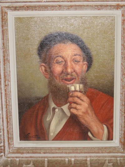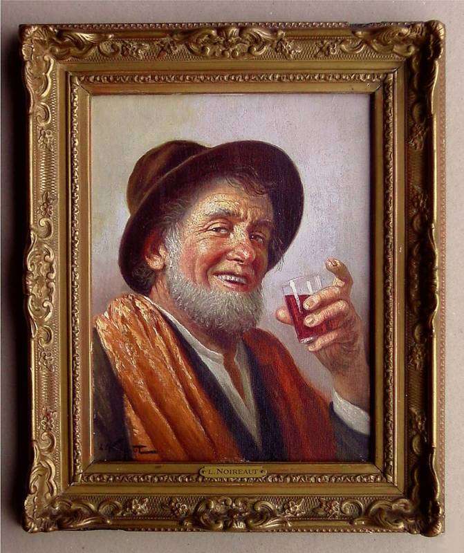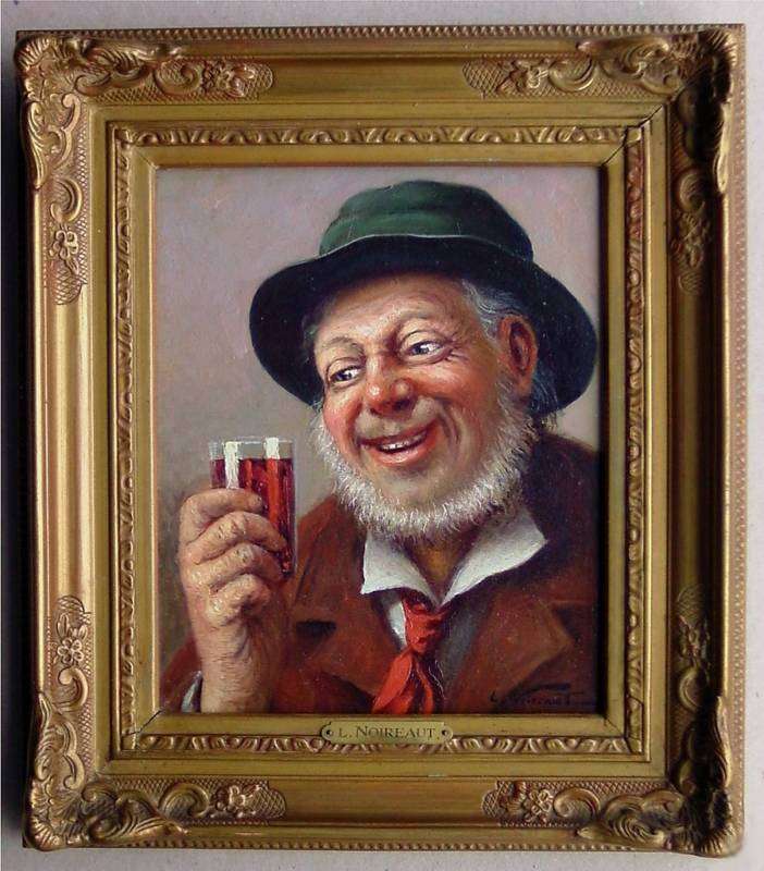 458 | Le buveur - freundlich lächelnder Herr mit grauem Vollbart, schwarzer Mütze und rotem Schal genießt ein Glas Rotwein. (Öl/Holz) Anmerkung: rechts oben signiert Ähnliche Motive: trinkende Männer | -/- (hoch) | Wurde im April 2021 auf der Seite www.interencheres.com erwähnt. |