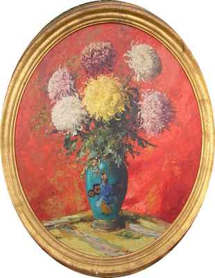050 | Chrysanthemen in Porzellanvase (Öl/Holz) Ähnliche Motive: Blumen | Oval | Sammlung Bechtold |