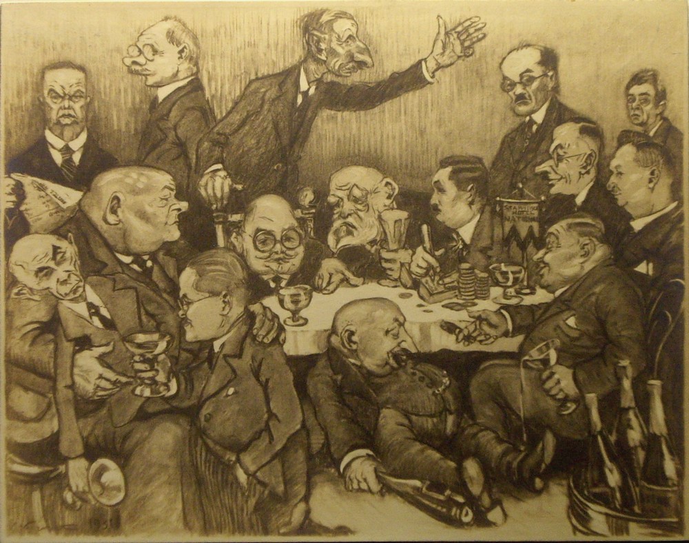 059 | Stammtisch Hotel National 1931 Karikatur (Kohlezeichnung/Papier) | (quer) | Sammlung Bechtold Hinweis: Das Original wurde bei einem Brand zerstört. |