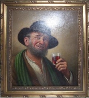 514 | Portrait Man Drinking - bärtiger Mann mit rotem Schal, Hut und brauner Weste hält mit prüfendem Blick, freundlich lächelnd ein Glas Rotwein in der rechten Hand. (Öl/Hartfaserplatte) Anmerkung: rechts unten signiert Ähnliche Motive: trinkende Männer | 41/33 56/48 (hoch) | Wurde im September 2023 bei www.ebay.co.uk (eBay item number:354993928626) angeboten. |