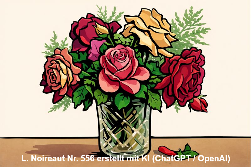 | 556 | Das Gemälde zeigt einen kunstvoll arrangierten Blumenstrauß mit unterschiedlichen Rosen in einer Glasvase (Öl/Hartfaserplatte) Anmerkung: rechts unten signiert Ähnliche Motive: Blumen | 35/27 (quer) | Wurde im Januar 2026 bei www.leboncoin.fr zum Kauf angeboten. Illustration 556 erstellt mit KI (ChatGPT / OpenAI) |