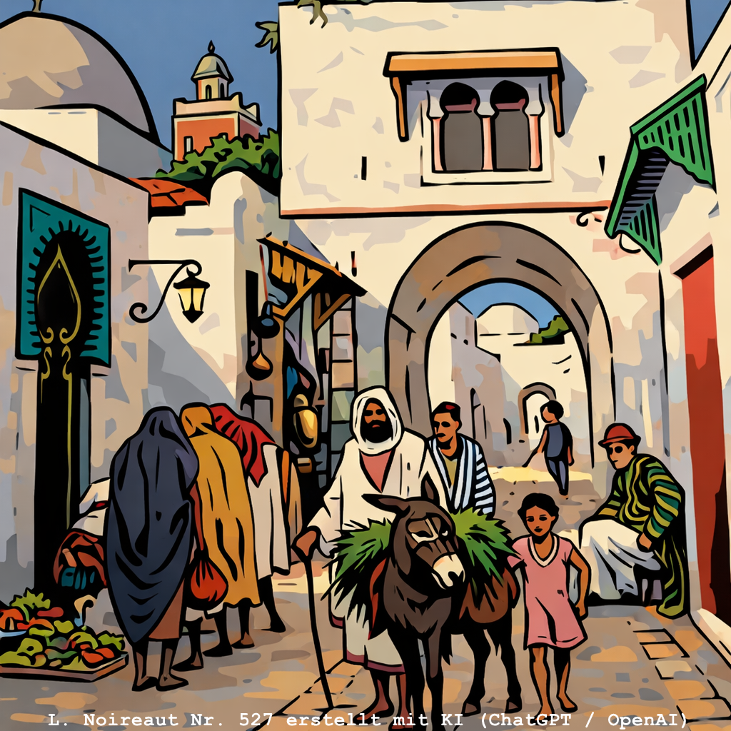 | 527 | Représentant une scène d'une ville du maghreb - Menschen und ein Maultier in einer Gasse in Tunis (Öl/Holzfaserplatte) Anmerkung: links unten signiert Ähnliche Motive: Nr. 0051, 0055, 0080, 0081, 0317, 0318, 0440, 0463, 0481 und 0489 | -×- (quer) | Wurde im November 2024 bei www.leboncoin.fr entdeckt. Illustration 527 erstellt mit KI (ChatGPT / OpenAI) |