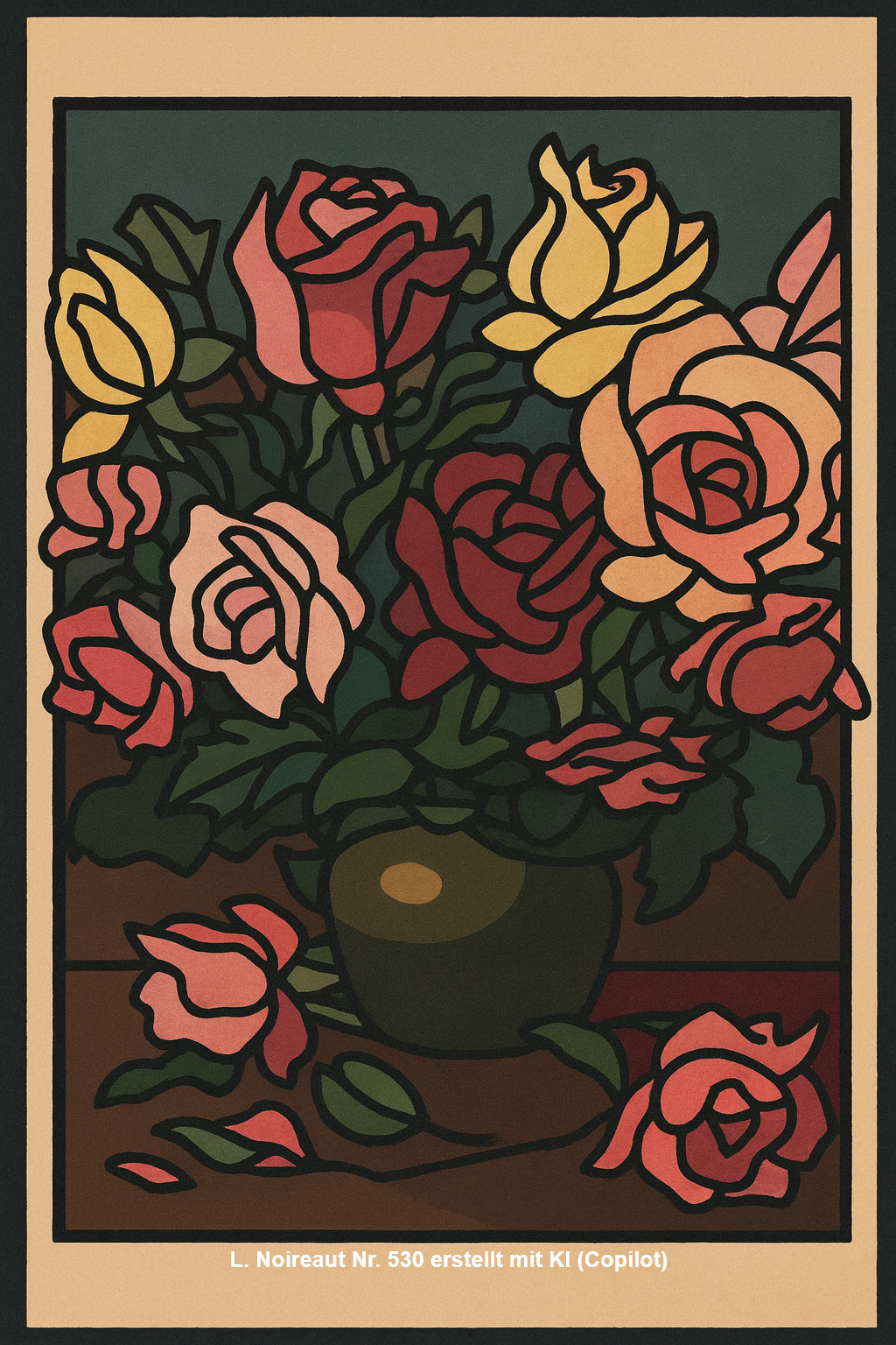 | 530 | Bouquet de rose - Ein Strauß mit Rosen in verschiedenen Farben in einer messingfarbenen Vase (Öl/Holz) Anmerkung: links unten signiert Ähnliche Motive: Blumen | -/- (quer) | Wurde im November 2024 bei www.leboncoin.fr entdeckt. Illustration 530 erstellt mit KI (Copilot) |