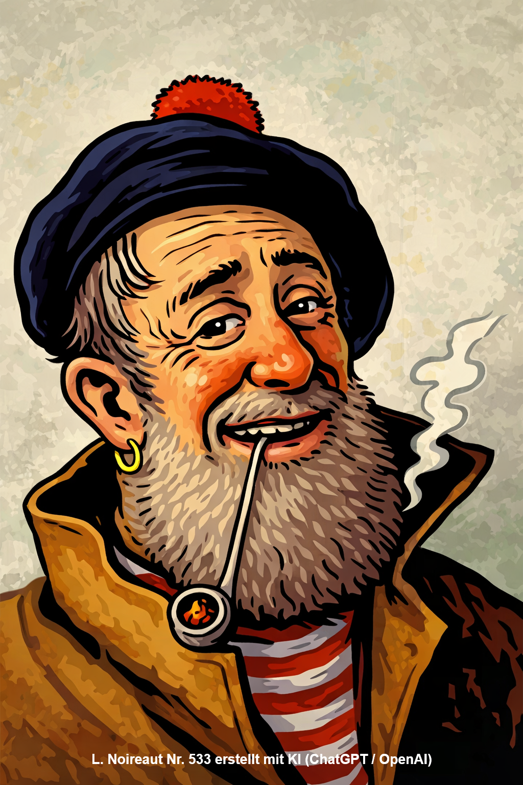 | 521 | Portrait de marin à la pipe - graubärtiger Seemann mit Ohrring und Pelzmütze gnießt eine Porzellan-Tabakspfeife. Im Hintergrund sind Fischerboote zu sehen. (Öl/Holz) Anmerkung: ohne Signatur Ähnliche Motive: rauchende Männer | 35/27 (hoch) | Wurde im Juni 2024 bei www.mutualart.com erwähnt. Illustration 521 erstellt mit KI (ChatGPT / OpenAI) |