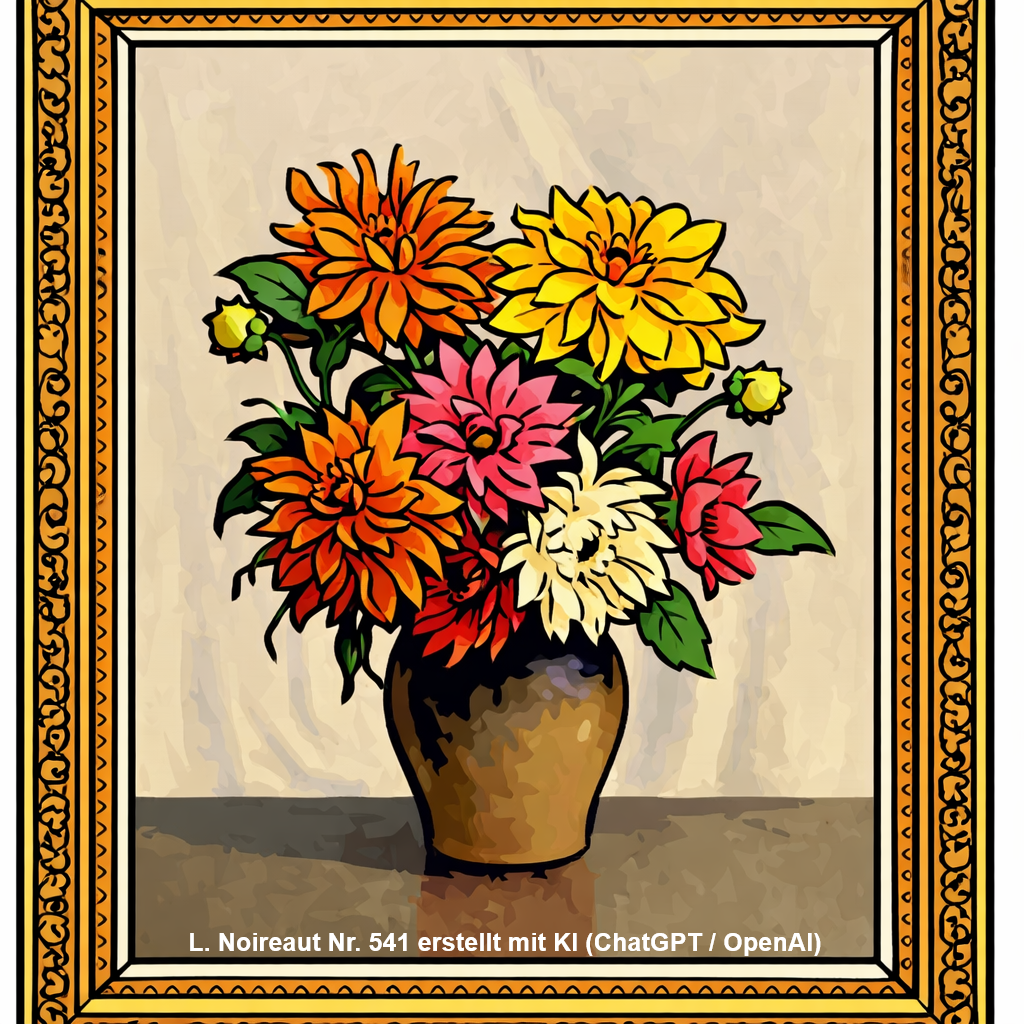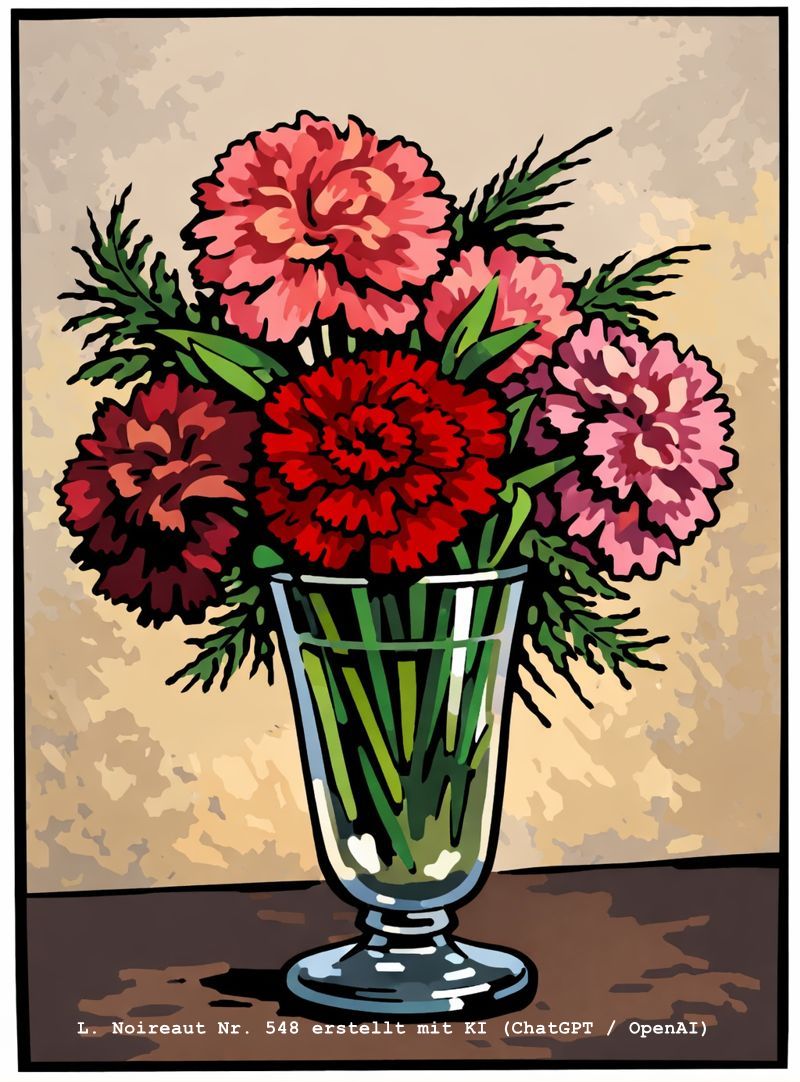 | 548 | Das Gemälde zeigt einen kunstvoll arrangierten Blumenstrauß in einer gläsernen Vase. Die Blüten – vermutlich Nelken – leuchten in kräftigen Rot-, Pink- und Violetttönen und werden von grünen Blättern sowie farnähnlichem Beiwerk ergänzt. Die Vase steht auf einer ebenen Fläche vor einem neutralen, leicht strukturierten Hintergrund, der die Farben der Blumen besonders hervorhebt. Der Rahmen ist goldfarben und verziert, was dem Bild eine klassische, elegante Note verleiht. (Öl/Hartfaserplatte) Anmerkung: links unten signiert Ähnliche Motive: Blumen und Nr. 0035 und 0036 | -/- (hoch) | Wurde im August 2025 bei https://gosit.firstindia.baby und https://www.alomseguros.com.br entdeckt. Illustration 548 erstellt mit KI (ChatGPT / OpenAI) |
