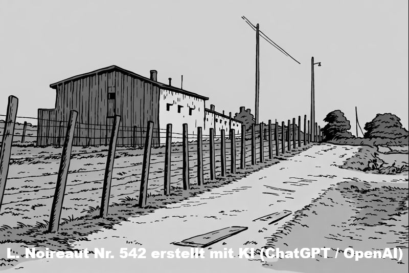 | 542 | 1915: Kriegsgefangenenlager (Ohrdruf bei Gotha) - der Bretterverschlag des Lagers hinter dem Stacheldrahtzaun (Tuschzeichnung/Papier) Anmerkung: rechts unten signiert Ähnliche Motive: 138 d-f | -/- (quer) | Wird aktuell bei www.leboncoin.fr angeboten. Illustration 542 erstellt mit KI (ChatGPT / OpenAI) |