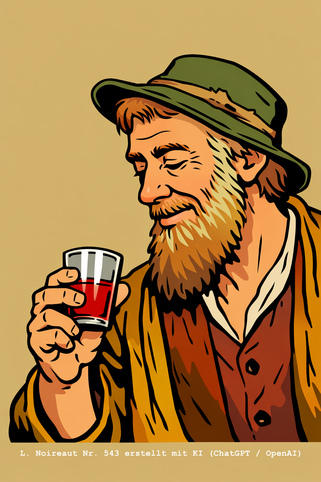 | 559 | Homme rieur buvant - freundlich lächelnder Mann mit braunem Hut und grünem Schal hält ein Glas Rotwein in der linken Hand (Öl/Hartfaserplatte) Ähnliche Motive: trinkende Männer | 35/27 (hoch) | Wurde am Januar 2026 bei www.ebay.fr angeboten (Artikelnummer: 406623049230). Illustration 559 erstellt mit KI (ChatGPT / OpenAI) |