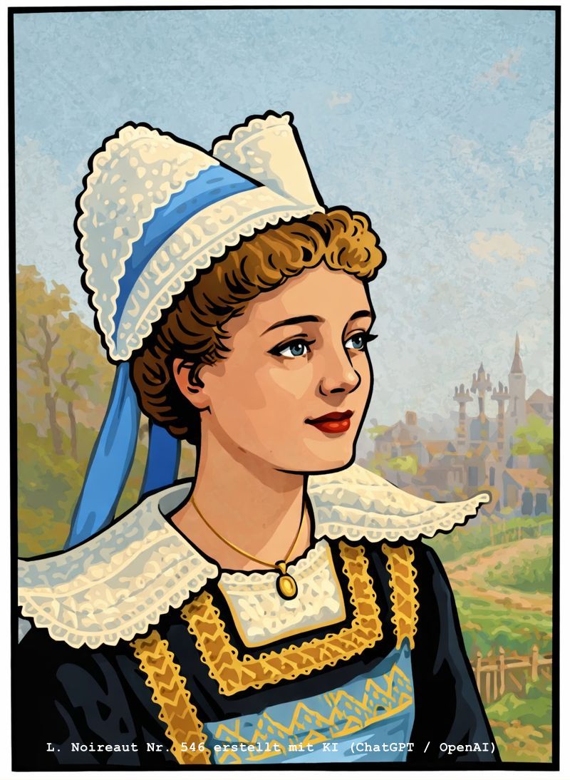 | 546 | Portrait jeune fille Costume Breton - Frau in traditioneller bretonischer Tracht mit typischer Spitzenhaube (les coiffes bretonnes) (Öl/Leinwand) Anmerkung: links unten signiert Ähnliche Motive: 139 und 0426 | 26/34 - 40/48 (hoch) | Sammlung S. B. Illustration 546 erstellt mit KI (ChatGPT / OpenAI) |