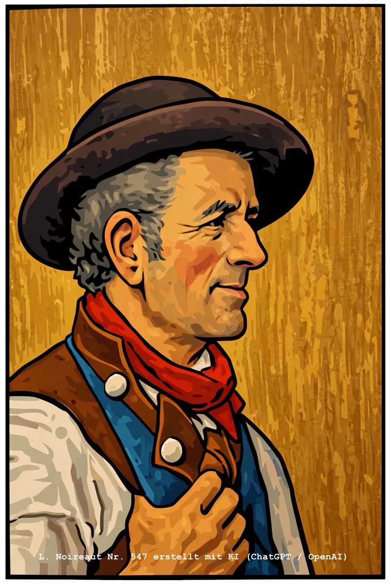 | 547 | Portrait of man maybe traveler - Halbprofilansicht eines schwarz-grauhaarigen Mannes mit schwarzem Hut, rotem Halstuch, weißem Hemd und blau-brauner Weste mit weißen Knöpfen der den Daumen seiner rechten Hand lässig in die Ärmelöffnung eingehakt hält. (Öl/Leinwand) Anmerkung: Signatur "Noireaut" rechts oben