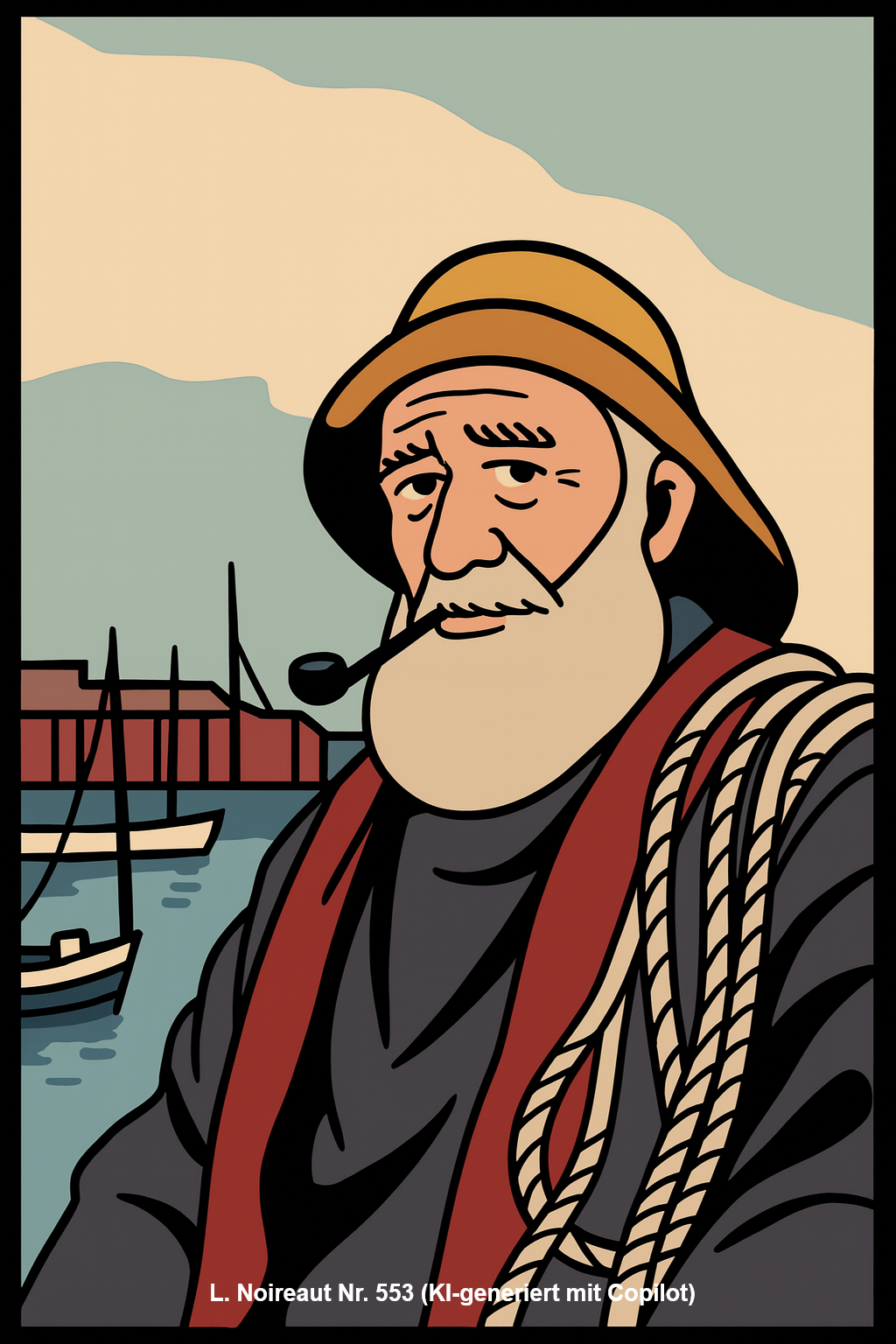 | 553 | Sailor in port - Seemann mit grauem Vollbart, braunem Fischerhut und rotem Schal gnießt eine Tabakspfeife. Im Hintergrund sind teilweise Fischerboote im Hafen zu erkennen. (Öl/Hartfaserplatte) Anmerkung: Signatur "E. BARO" rechts unten Ähnliche Motive: rauchende Männer | 34/37,5 (hoch) | Wurde 01/2026 bei www.drouot.com entdeckt. Symbolbild 553 (KI-generiert mit Copilot) |
