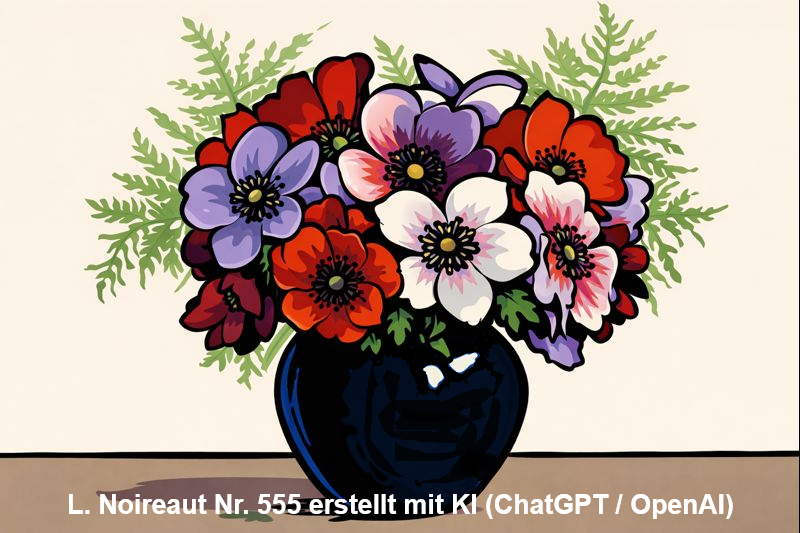 | 555 | Das Gemälde zeigt einen kunstvoll arrangierten Anemonenstrauß in einer schwarzen kugelförmigen Vase (Öl/Hartfaserplatte) Anmerkung: rechts unten signiert Ähnliche Motive: Blumen | 35/27 (quer) | Wurde im Januar 2026 bei www.leboncoin.fr zum Kauf angeboten. Illustration 555 erstellt mit KI (ChatGPT / OpenAI) |